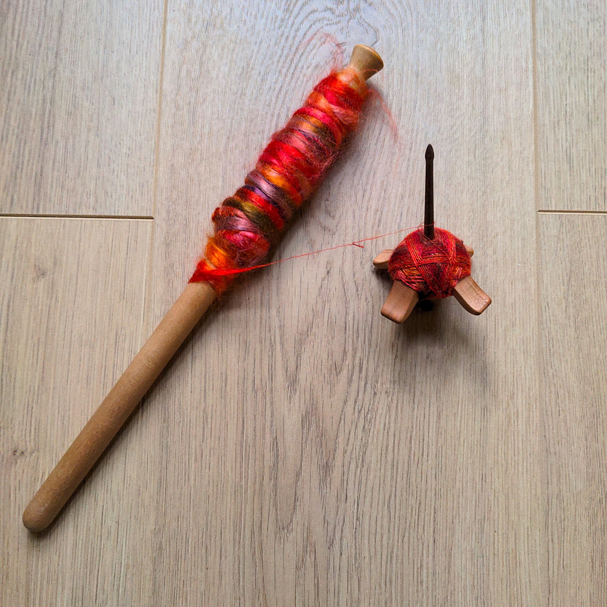 Ok, ok, voor ik het op wond ging ik dat deel eerst ketting twijnen. Dit afwisselen van spinnen en twijnen heet in het Engels “ply on the fly” en ik vind het een zeer prettige methode om garen te maken met een Turkse spintol, zeker als het gaat om dun draad.